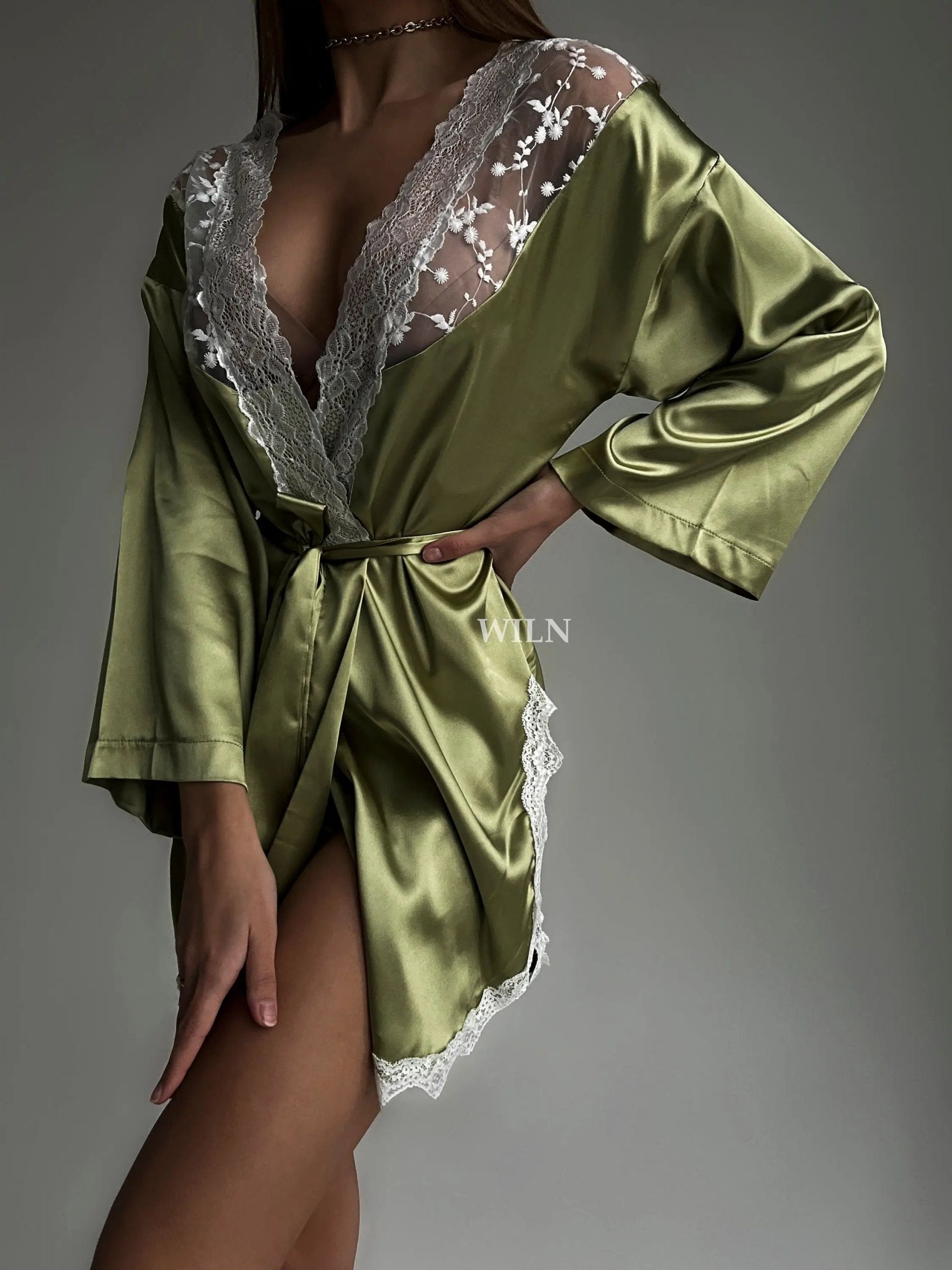 Channel your inner royal in this sumptuous bridal Robe in green satin. The elegant flowy long sleeves of the kimono will make you feel like a goddess! It doesn’t get much more luxurious – or bridal – than that. Celebrate your wedding day or any other day with this getting-ready dressing gown that’ll always remind you of your special day.
