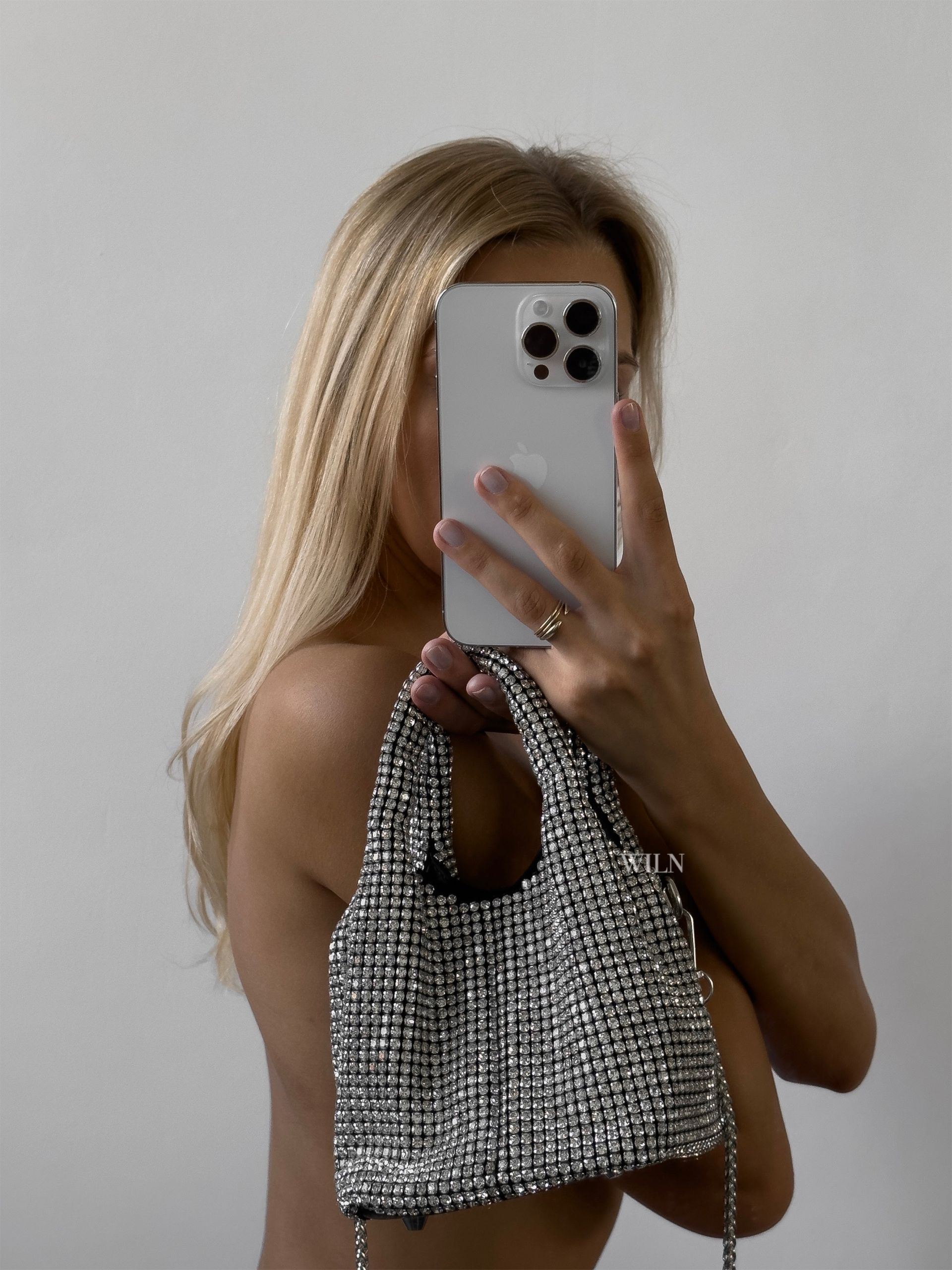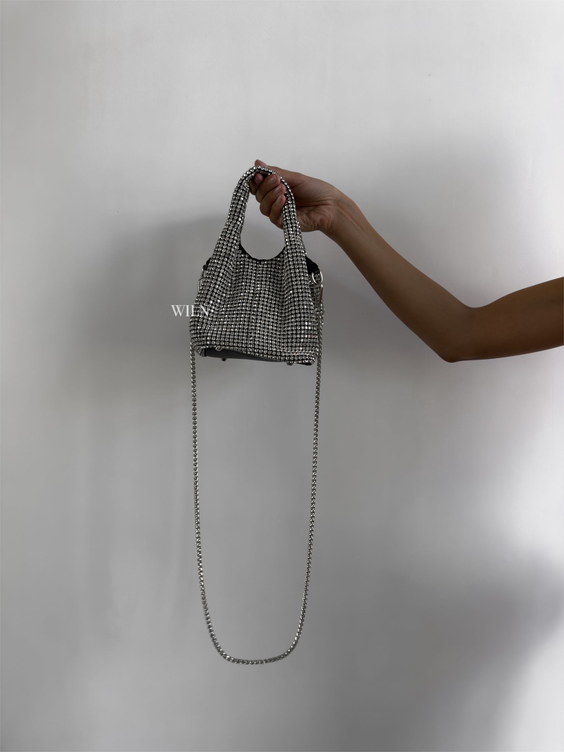 The ultimate sparkle bag inspired by starry nights! DECADENCE is a stylish medium-size bucket handbag. Hand-crafted in high-quality rhinestone crystals, it completes an elegant yet chic look that will turn heads and make you the party star. The shiny handbag comes with a detachable silver chain strap, allowing you to wear it hands-free or as a clutch. 100% vegan and cruelty-free.